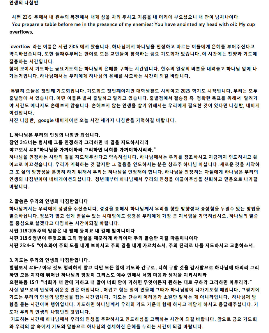 첫번째 overlflow가 있었습니다. 하나님의 은혜를 구하며 찬양하고 기도하는 풍성한 시간이었습니다.