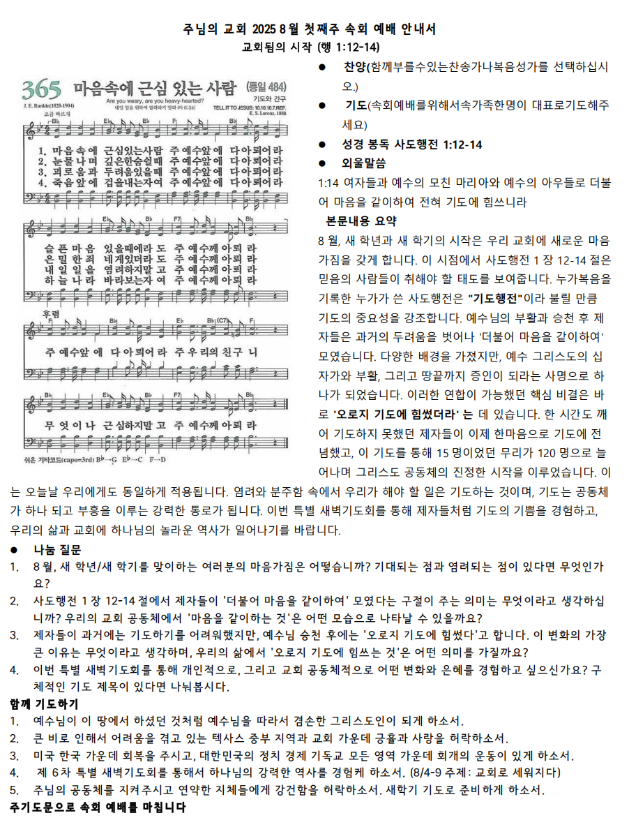 2025 8월 첫째주 속회 예배 안내서 교회됨의 시작 (행 1:12-14)