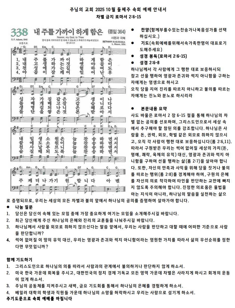 주님의 교회 2025 8월 다섯째주 속회 예배 안내…