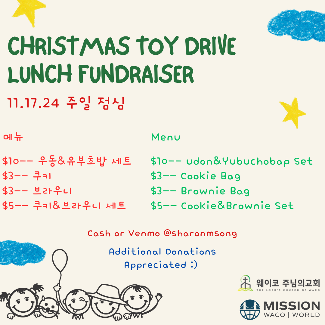 Young Adult Ministry 에서 Mission Waco의 Christmas Toy Drive 에 Toy 도네이션을 위해 Fundraiser를 준비했습니다. 함께 참여하며, 크리스마스를 맞아 예수 그리스도의 사랑을 지역과 나누는 은혜가 있기를 기도합니다.
