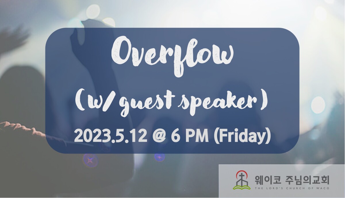 EM ministry의 찬양과 기도모임인 Overflow 의 봄학기 마지막 모임이 5월 12일에 있습니다. 한 학기 동안 지켜주시고 인도하여 주신 하나님의 은혜를 찬양하고 함께 기도하는 시간을 갖습니다. 이제 많은 청년들이 여름방학을 맞아 다양한 곳으로 떠나게 될 텐데, 방학동안 계속해서 하나님과 동행하는 청년들이 되기를 기도합니다.