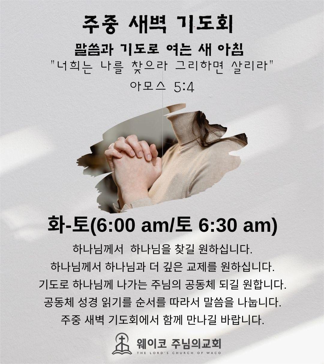 다음 주부터 주 중 기도회가 시작됩니다. 주 중에는 원하는 분들만 새벽에 나와 자유롭게 기도하는 시간이었습니다. 저에게도 이 시간은 너무나 소중하고 친밀한 시간이었습니다. 그러나 하나님께서는 함께 말씀과 찬양으로 그리고 기도로 하나님께 더 집중하며 교제하길 원하심을 느끼게 되었습니다. 우리 함께 새벽을 깨우길 원합니다. 마지막 시대에 늘 깨어 있는 주님의 공동체 되길 간절히 바랍니다 .