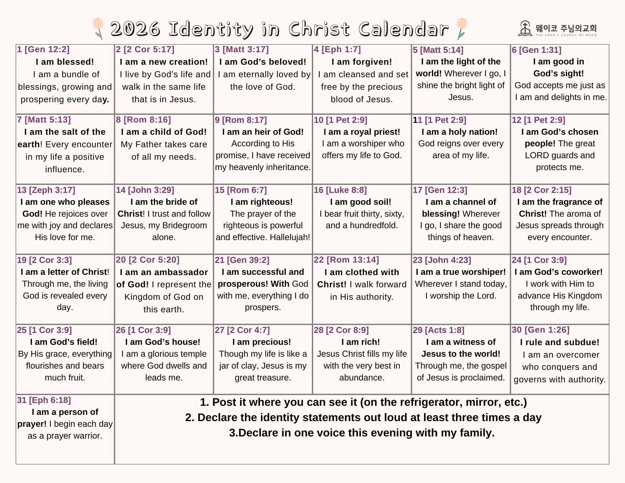 이번 정체성 선포 기간을 통해, 주 안에서 우리의 존재가 얼마나 고귀하고 묵직한지 깊이 경험하시길 바랍니다. 함께 고백하고 선포합시다. 우리는 하나님의 자녀이며, 이 땅의 복의 근원입니다.