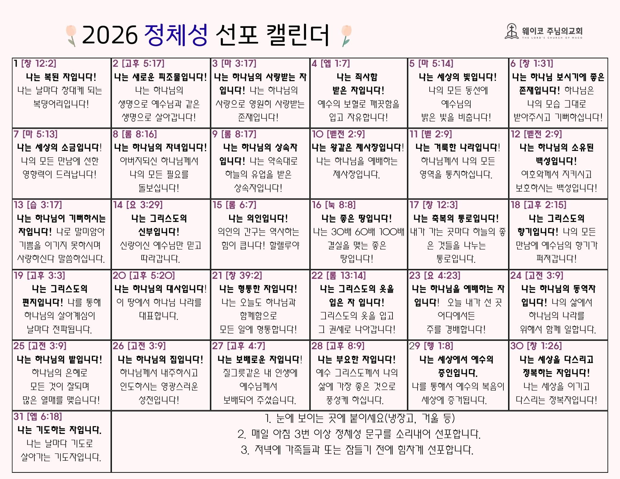 이를 돕기 위해 교회에서는 ‘정체성 선포 캘린더’를 준비했습니다. 냉장고나 눈에 보이는 가까운 곳에 붙여 놓고 매일 아침 그리스도인의 정체성을 선포하며 세상 속에서 당당하게 승리하기 위한 믿음의 훈련입니다. 이 훈련은 지난 커넥트 수련회 강사였던 최상훈 목사님(화양감리교회 www.hwayang.org)의 메시지에서 깊은 영감을 얻었습니다. 알래스카 이민 목회를 마무리하고 한국에서 사역을 시작할때 12명의 청년을 1,000명의 부흥으로 이끄신 그 원동력 역시, 성도 한 사람 한 사람이 존재의 가치를 회복하는 데 있었습니다.