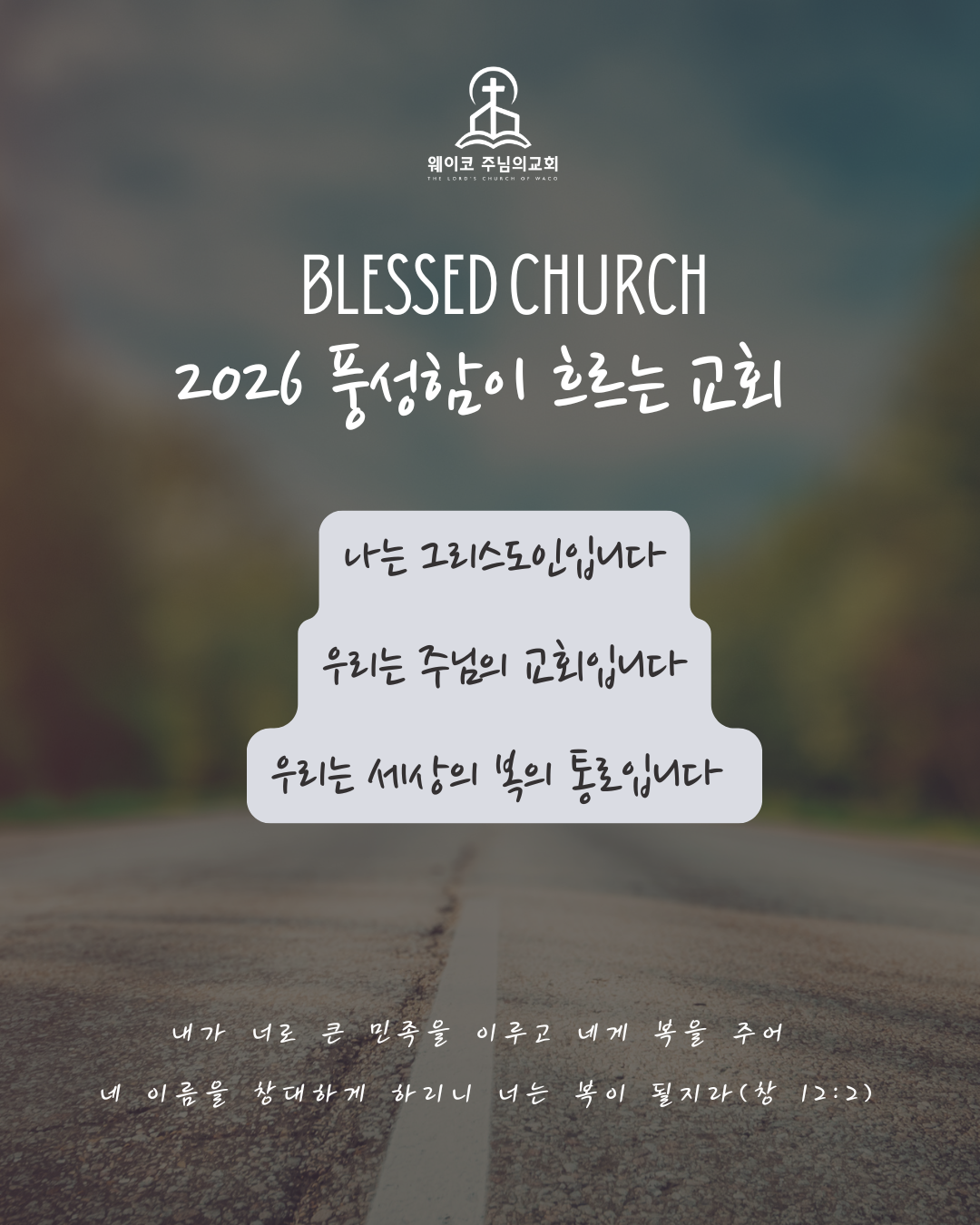 웨이코 주님의 교회 성도 여러분, 2026년 새해가 밝았습니다. 송구영신 예배를 통해서 함께 공동체가 함께 기도하며 하나님의 도우심을 구하며 2026년을 시작할수 있음이 얼마나 감사한지요. 하나님께서 주님의 공동체에 행하실 일을 기대하게 됩니다.