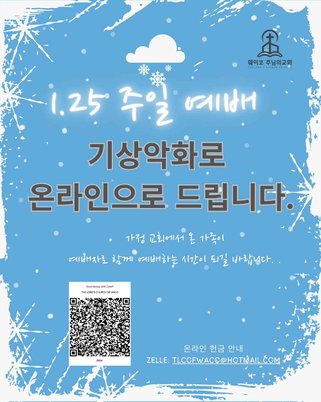 특별히 주일 예배는 교회에 가장 중요한 사역중에 하나입니다. 날씨로 인해서 주일에교회에서 모여서 예배할수 없음에 매우 안타까운 일입니다.